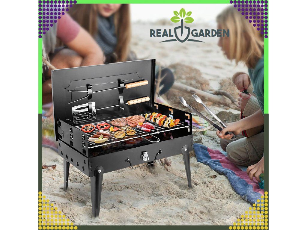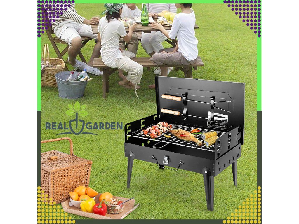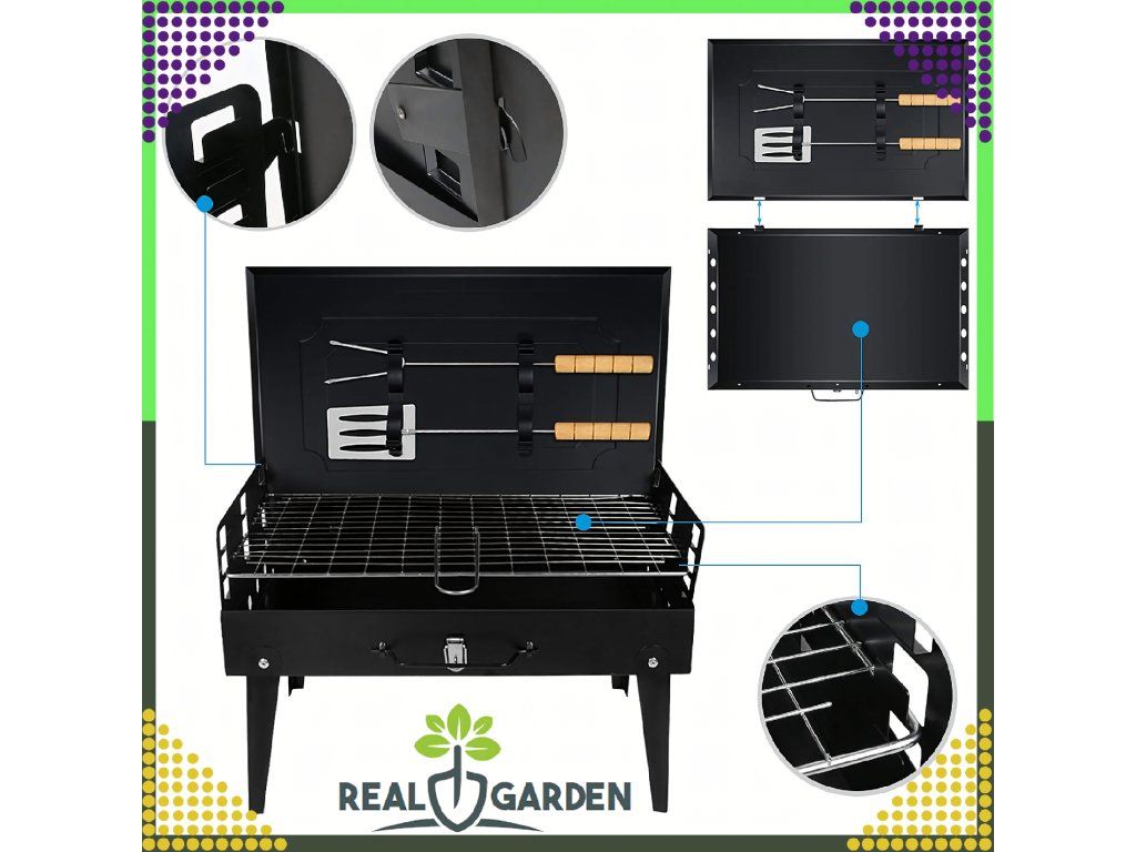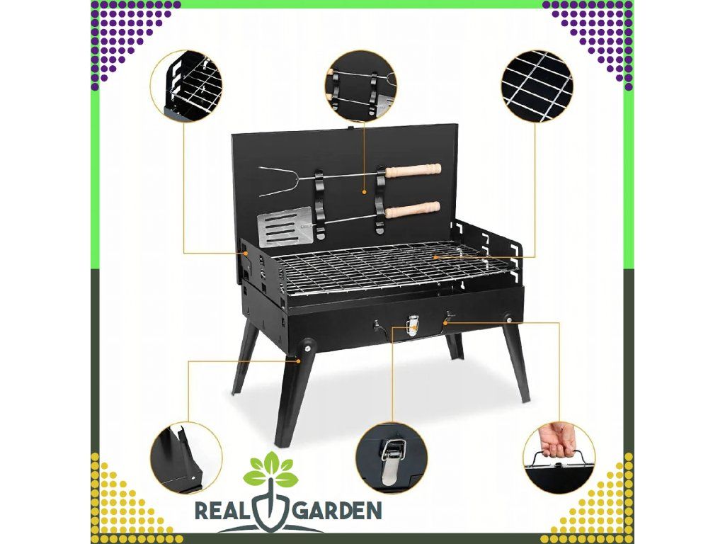 ✔️ Skládací ✔️ Přenosný ✔️ Rozměry: 44x27x47 ✔️ Barva: Černá ✔️ Rošt + Příbory