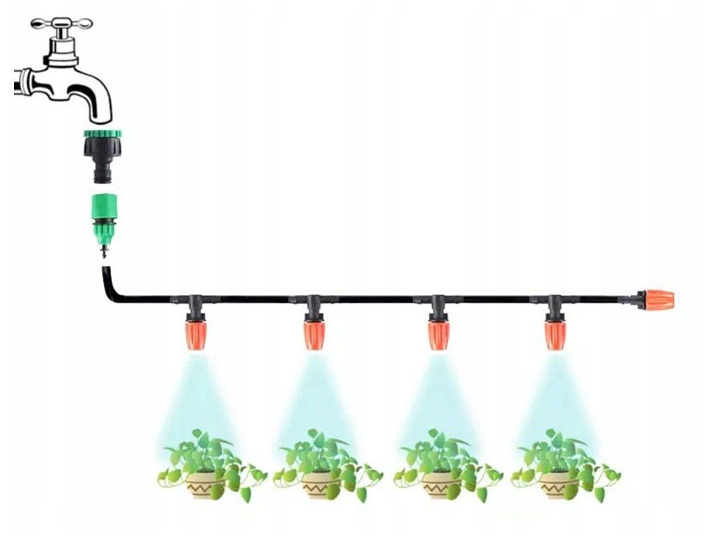 Stačí připojit vodní kabel a zavlažovací systém se automaticky spustí a začne stříkat. Nespotřebovává přitom žádnou elektrickou energii.